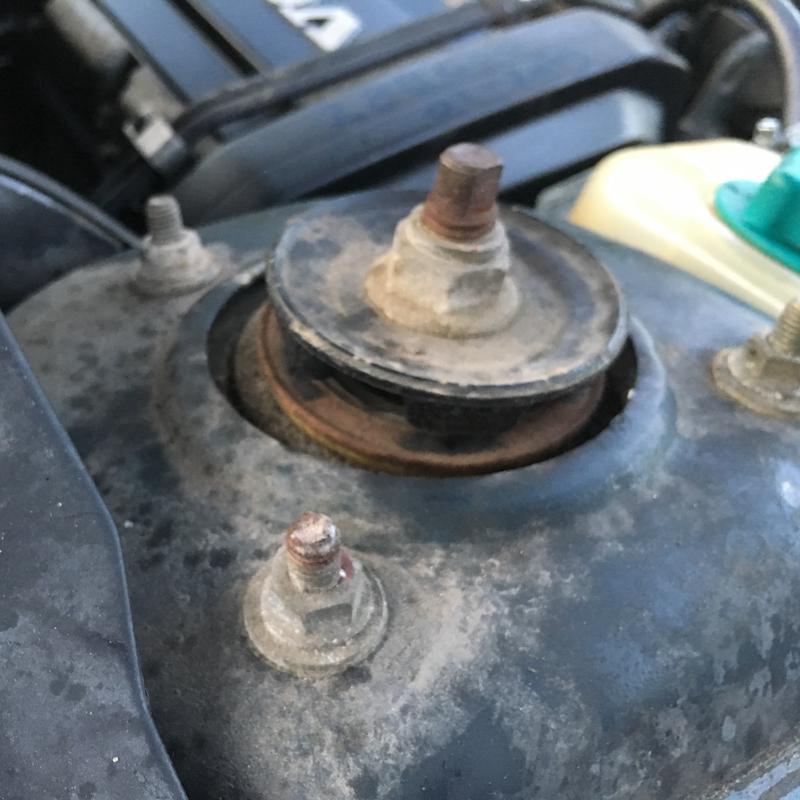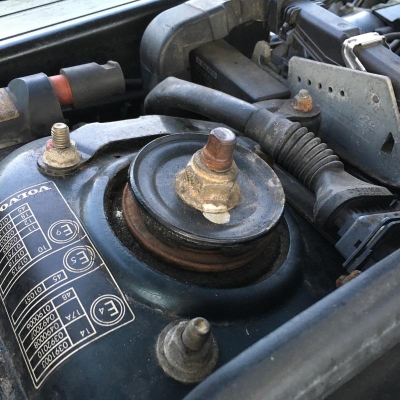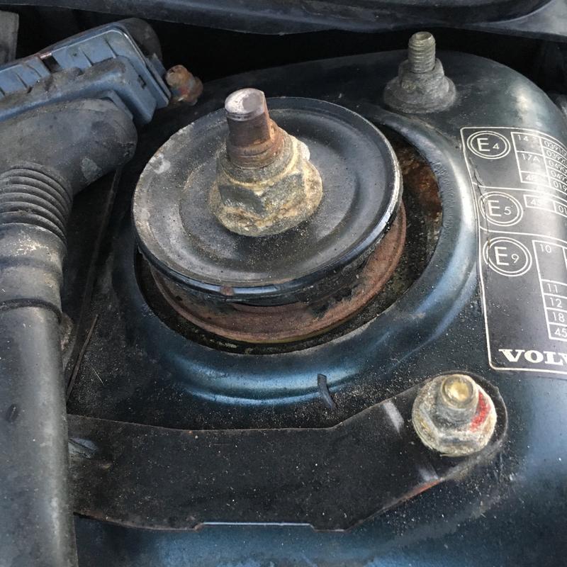 Controleer de rechter veerpootzitting eens, durf er bijna om te wedden dat die gaar is, zo op afstand beoordelend op de foto van de motorruimte.