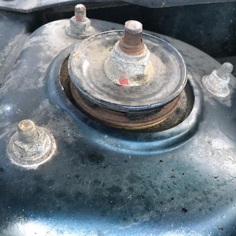 Bovenste moer eraf halen, metalen schoteltje eraf en dan het rubber van de veerzitting inspecteren. Just to be sure.
