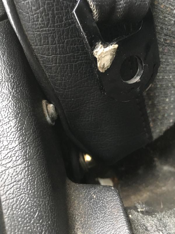 Nog even verder gekeken naar de auto, en het blijkt dat de veiligheidsgordel rechts achter helemaal niet met de onderste bout vast zit...